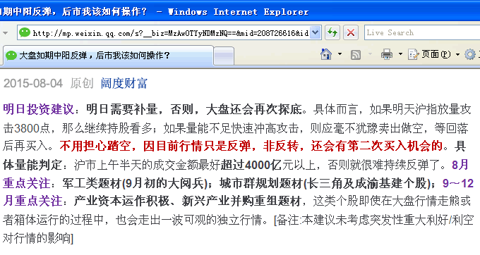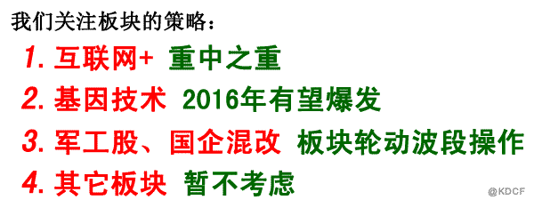 4.3 后市还会有机会么?回答:有,一定有,而且还不止一次的机会。目前强者恒强,我们宁可用贵的价格去买互联网++龙头股,也不愿意用便宜的价格去买无人问津的股票。互联网++龙头股,中国经济增长的主要新生驱动力和生产力,未来也许会涨到10000亿人民币(参照美股1600亿美元)的市值,一切皆有可能,我们深信:像苹果、google、微软、阿里等等这样市值由小巨变的公司,在中国股市也一定会诞生!