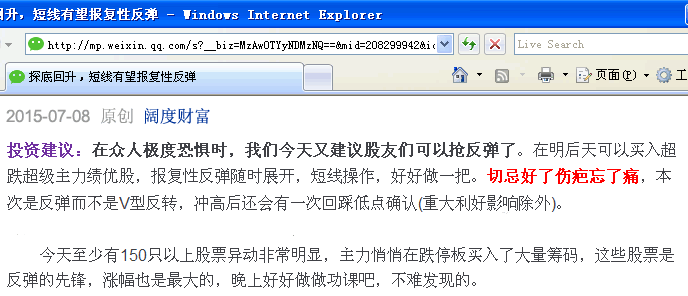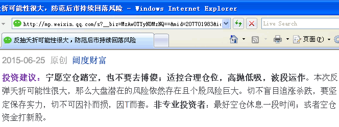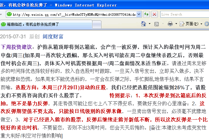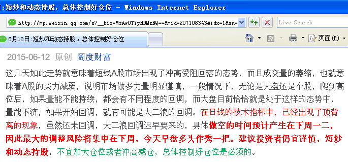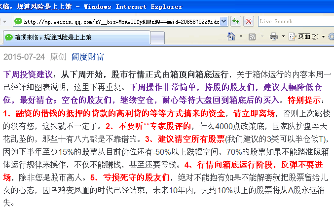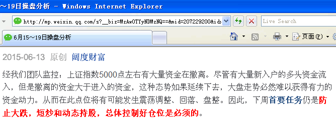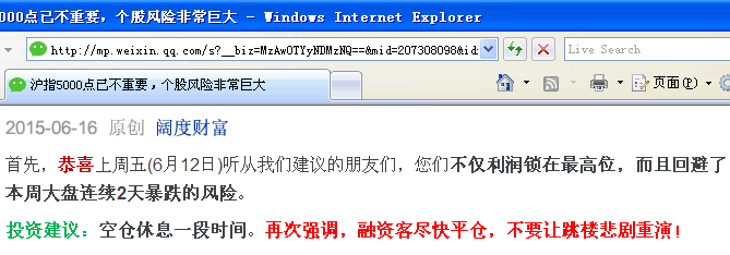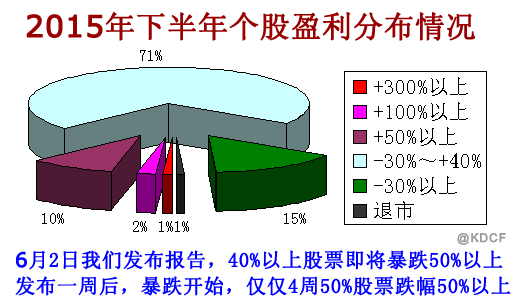 2014年5月开始,我们建议股友们不要买车买房买理财,甚至可以把值钱的典当和抵押,把所有资金全部投入股市,一路持有做多。2015年6月2日在我们官网发布公开报告,40%以上股票即将暴跌50%以上,发布2周后,暴跌开始,仅仅4周时间,50%的股票跌幅超过50%以上。从2015年6月3日到6月12日,我们建议所有股友们全部清仓,6月12日周五午盘最后提示“具体做空的时间预计产生在下周一二,因此最大的调整风险将集中在下周,建议投资者冲高减仓,锁住利润。直到7月7日,我们一直提示股友们空仓,切不可补仓,更不可抄底,严控贪婪和欲望。7月8日,我们在暴跌以来第一次发布建议股友们大胆买入,主动买套,股友们又精准地踏准节奏,赚得盆满钵盈,实现财富急剧倍增。